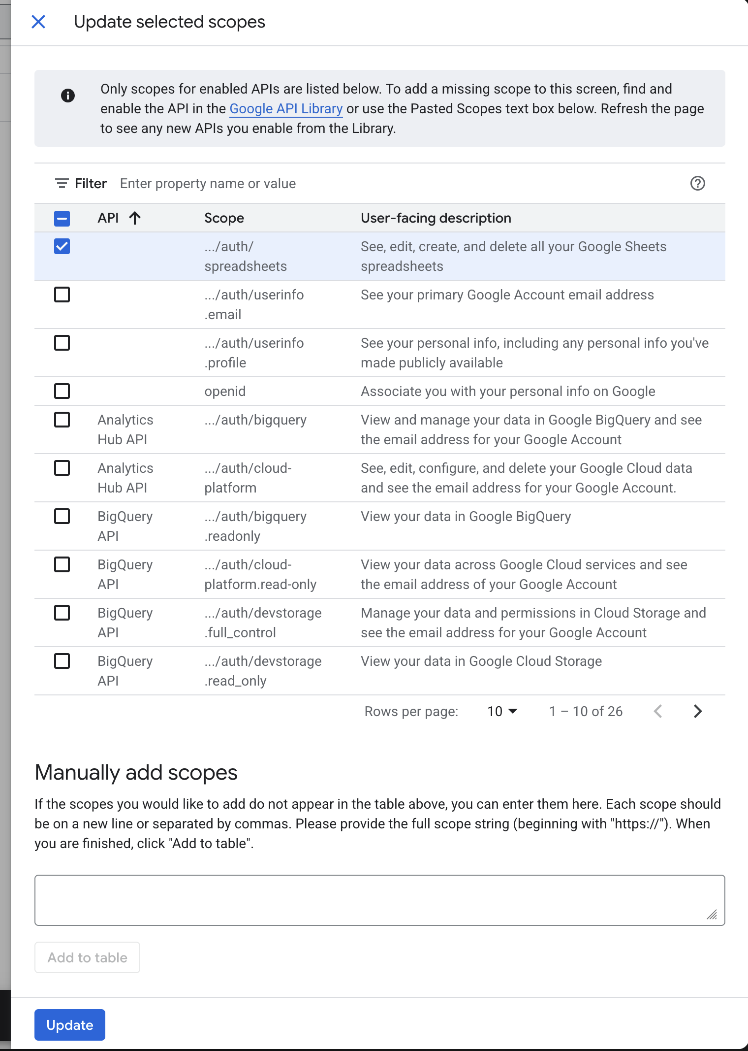 - Click the “Add or remove scopes” button. You should see a list of available scopes, as shown below. Select the scope labeled “See, edit, create, and delete all your Google Sheets spreadsheets.”